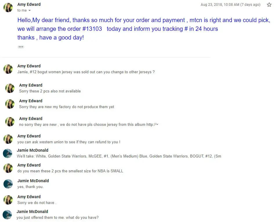 The business model for this website is to promise any jersey you want. Any sport, any team, any style, any player, any size. And then after you pay them they say they don't have that style jersey, they don't have that player, they don't have that size. In the end you find out they don't have any jerseys at all, they won't send you anything, and they will not refund you.