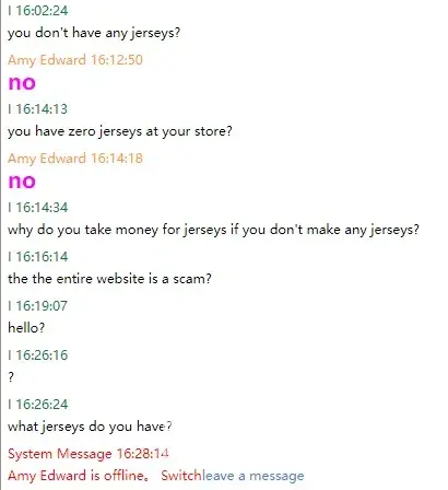 I bought two jerseys from the website www.amynfljerseys.ru. After I paid for the jerseys, I waited for any updates or info about my order, but the seller didn’t provide the confirmation email or the tracking number. Also he didn’t communicate with the customers. I sent a lot of emails, but the seller didn’t respond at all. I waited couple of weeks, but nothing. These people are scammers and liars, who take money and provide nothing. Please post your comments about this company.