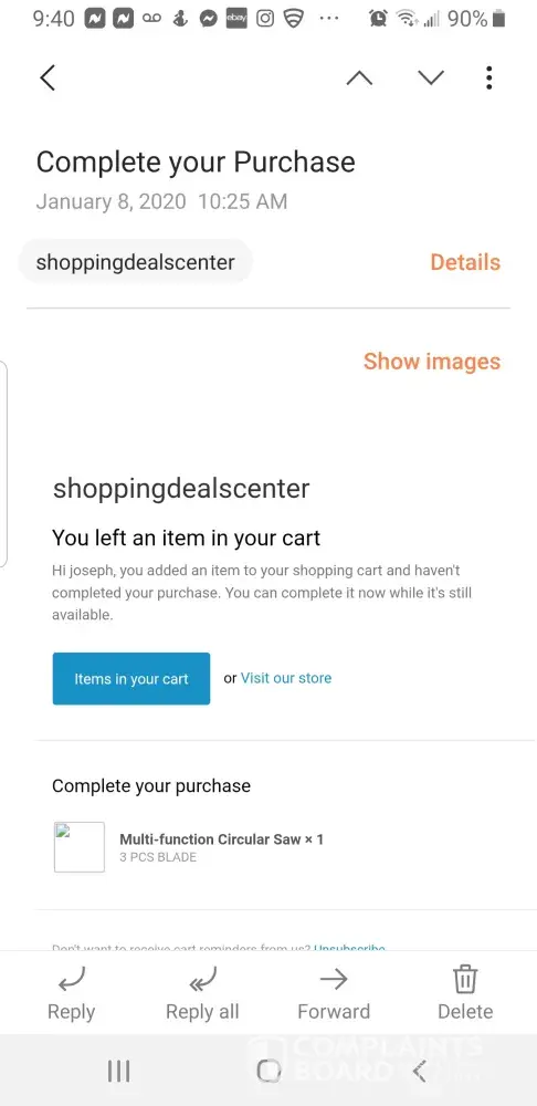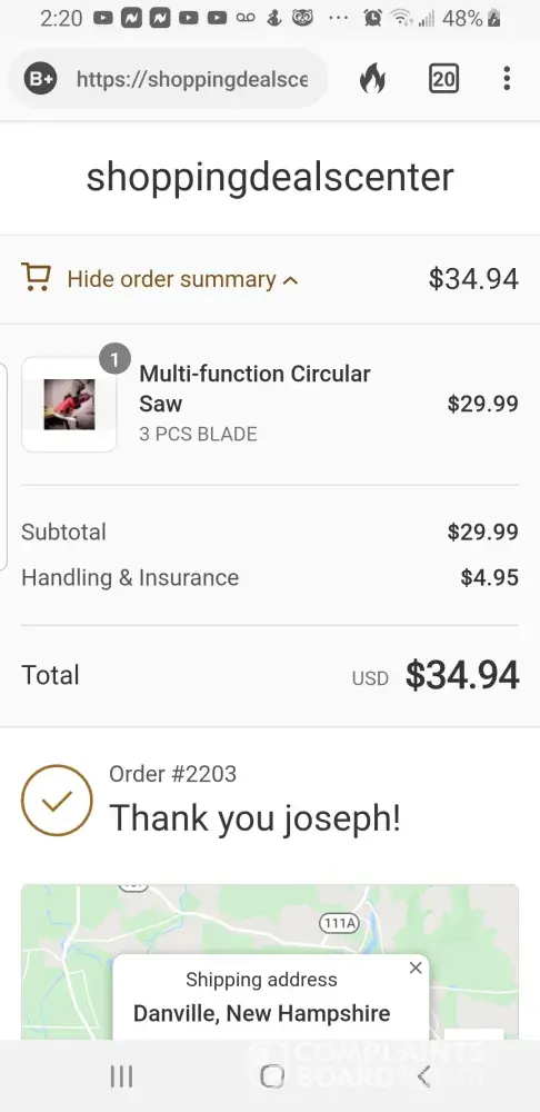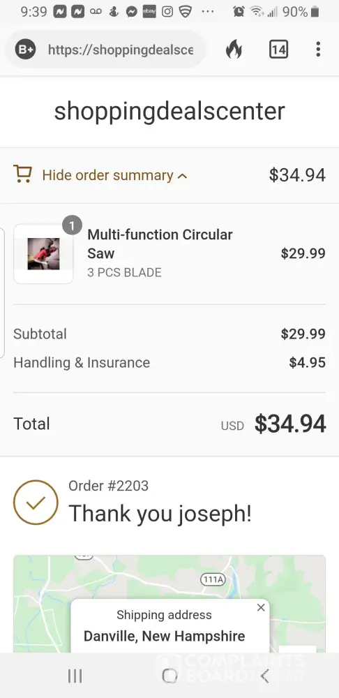 January 8-9 I started a purchase of "multi function circular saw and blades". I stopped short of completing this. Online shopping deals, or Swipe up deals sent me an email to complete my deal. So I did, I paid 34.94$ with ship, and insurance. I got an invoice and tracking for my purchase of the saw and 3 blades included. 3 weeks and no information, I asked PayPal to look into it. About 10 day ago, I received an envelope about 6"×5" 1 quarter inch thick with 3 circular saw blades package and nothing else. The tracking was on the envelope, no saw. Many emails later, an associate contact told me the 3 blade order was all I purchased. Even though the price above included the saw. Now i'm losing my mind! I included the invoice many times, pictures ect. No response but to send the saw blades back for a refund. To do that, the cost with tracking will be 37$ plus change. I can't be that dumb! So the company above stole my saw I paid for and my money. I tried to cancel this purchase moments after executing it, but was told it was too late, and that I will be happy with my purchase. I don't know why this was done to me, and this whole experience sucked. I will contact every outlet I can to relate this experience. I'm 63 years old, do you think I need this?! Screenshots are included.
