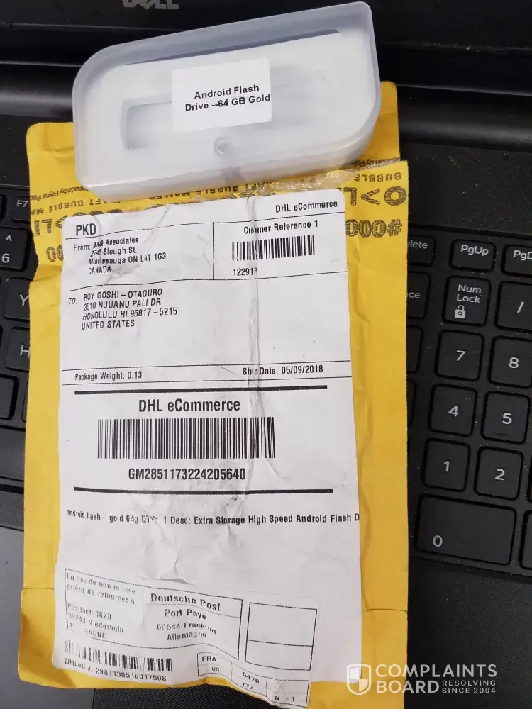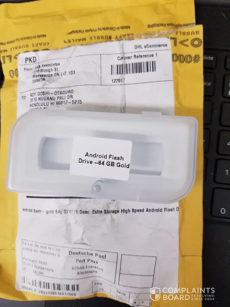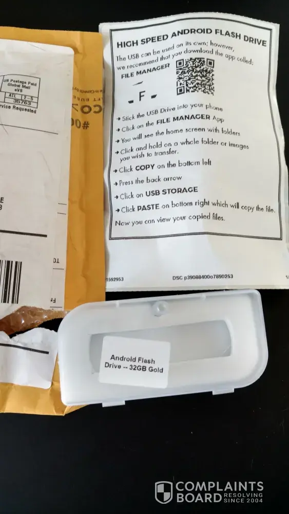 The box is empty. They sent me nothing. There is no receipt, no packing slip, no invoice . Just a mail envelope and an empty box. I am enclosing pictures that show the envelope and empty box. I thought I was ordering from a reliable source. I thought the last flash drive I got was from Mobstub thru AN Associates.