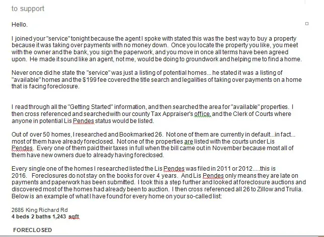 They made it sound awesome and a good deal on the phone. Then after I paid I started doing more digging and found out that it's a big scam they said they can refund me my money until 90 days even though I just made the transaction within two hours of me calling back. They were rude. So now basically lesson learned but it's the principle of the matter times are tough and it sounded good. One of the houses is next to where I live now which I know isn't in for closure. It's bs they can do this without having been sued