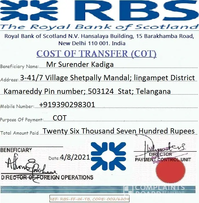 My name is Kadiga Surender I got a message of winning 4cr65lacks rupees from RBS Bank how can I contact them please help me