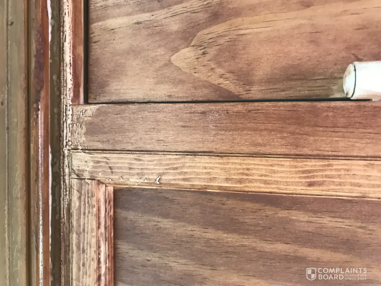 We ordered a henged patio door unfished pine interior.. Door has 3 coats of stain and I noticed on the trim on the top is a different color and wood texture is different.. So the color isn't the same on other parts of the door.. Trim looks defected.. I would like someone from anderson to come and take a look.. Wr purchased the door from home depot and they told me to contact you guys..:i'm enclosing pictures of the problem.. Please contact by email at candlenut2 @comcast.net or by phone at [protected]...