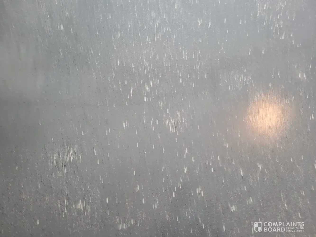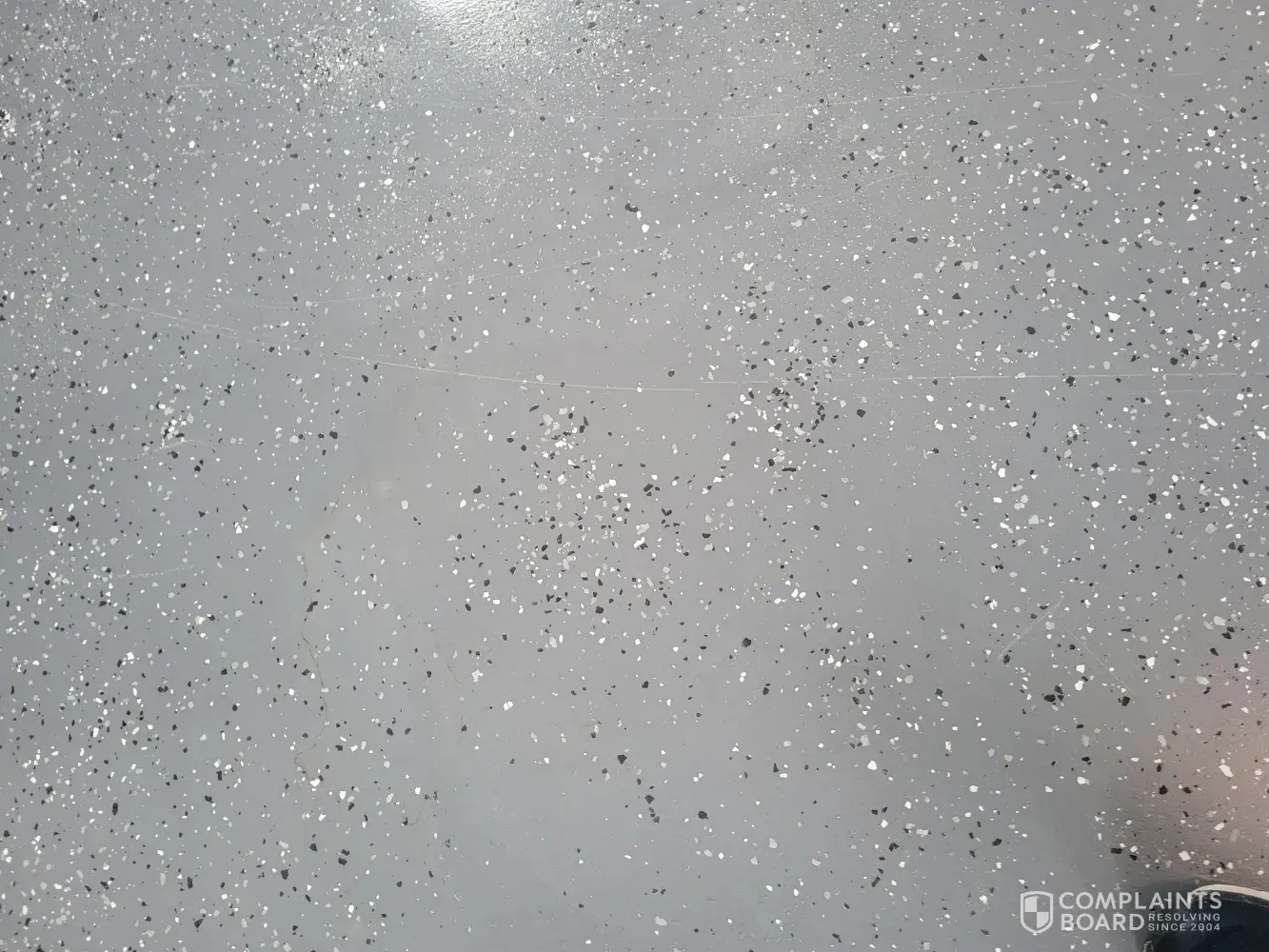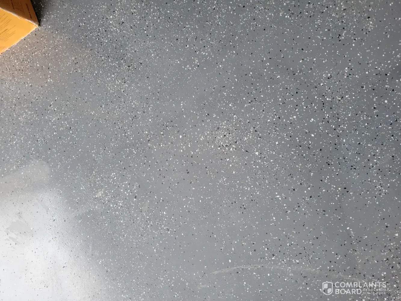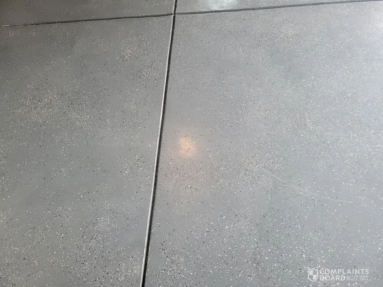 The finish is very uneven, the flaking is clumpy, uneven and looks like a child did it. There are stop marks in the finish, there should be a clear topcoat on top of the flakes and that was not done. The finish was supposed to be a commercial grade, to hold up to things being moved around in a garage as well as my truck going in and out. The finish is scratching and already showing wear and it's only been a couple of weeks. You can see the tire wear, were my truck goes in and out. You can see the cracks in the concrete that were supposed to be filled and covered, not visible after the application was complete.