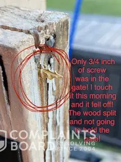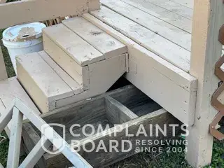 Construction and craftmanship of rebuilt areas is substandard. Joints are not even, some were not even screwed down properly. Surfaces are not level and square. Steps were smaller than normal width, not covering the entire gate area. The steps are not level and they are small. The gate is poorly installed and designed. Due to poor installation, the gate fell off after one use. Exterior paint sealer poorly applied and many areas remain uncoated. It is questionable if two coats were applied to the entire deck surface.