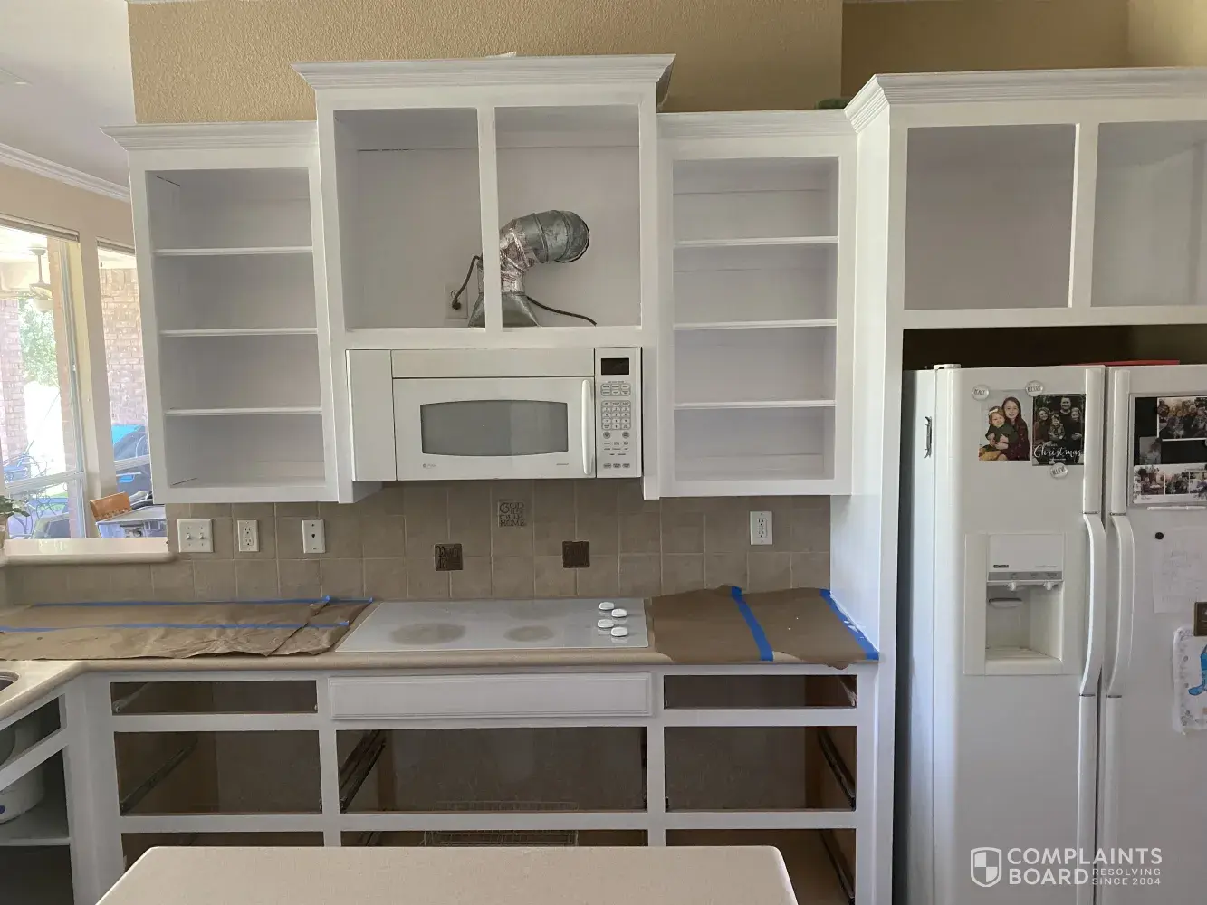 Troy asked for more money to do what was already in the contract. We said no. He pulled his helper off the job. Had already been paid $6800.00 (50%). He hadn't completed a 1/4 of project. Because of the damage to kitchen/drawers/doors new contractor has to sand everything and start all over. Contractor brushed cabinets, didn't spray. Didn't completely mask off walls and trim as stated in contract. Could see the nail hole repairs through the one coat of paint. Sheriff had to be called to get our cabinet doors and drawers returned. Troy stacked them by the garage door. All of them scratch/dented. Troy Smith on his in walked off the job with $6800.00. As stated by the sheriff to do, a suit has been filed against him.