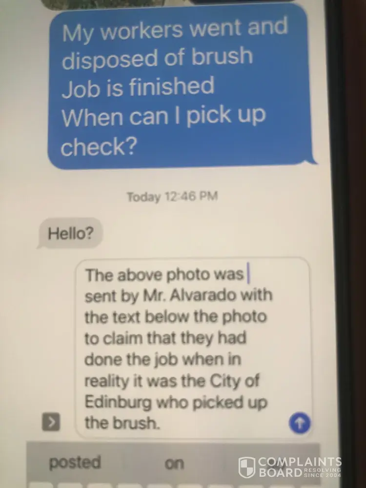 On Wednesday, 11/17/2021, Mr. Alvarado wanted the remainder of his payment of $375.00, since I had issued a check to him of $300.00 on 11/4/2021. I asked for an adjustment on his quote since he did not haul out the brush; and he refused claiming he had done the complete job, which he did not. On Wednesday 11/17/2021 I called the city to confirm who had removed the brush on Monday 11/15/2021 because Mr. Alvarado was claiming he had done so. The city confirmed that they had removed the brush.
