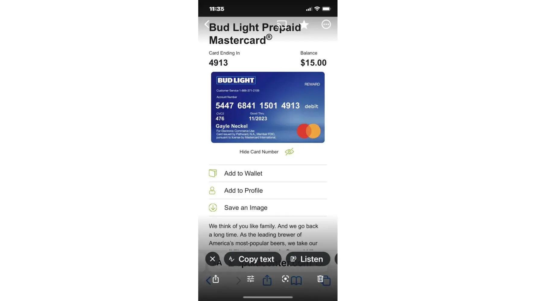 I received a $15.00 virtual rebate, card number [protected], good thru 11/2023, CVC2 476, name on card Gayle Neckel. I have tried to use the virtual card at several places and none will except a virtual card. I would like to have a card sent to me so I can take advantage of this rebate.