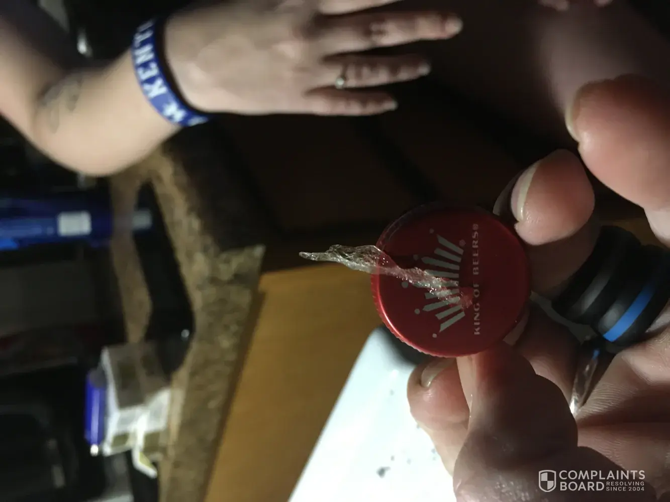 Purchased a 12 pack at Dierbergs February 25, 2020. Beer was immediately refrigerated from carton, carton was recycled along with receipt. Upon opening one bottle the next evening saw that I had rust on my hands from bottlecap. Immediately cleaned my hands, continued on to take a drink from bottle to notice black flakes all around bottle top.