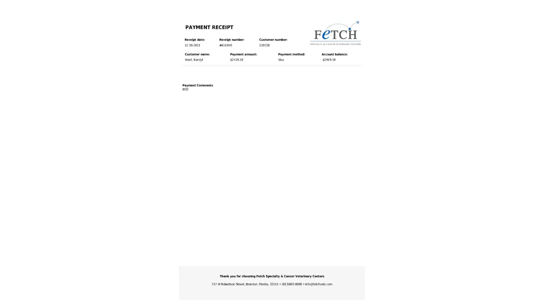 I am filing this complaint because I am just disgusted at how our beloved Sophie was treated at Fetch Specialty and Cancer Veterinary Centers in Brandon, FL. At the onset of our puppy girl starting to have issues with labored breathing overnight and had her seen at a different facility that diagnosed her with Bronchitis and was given medication. When the...