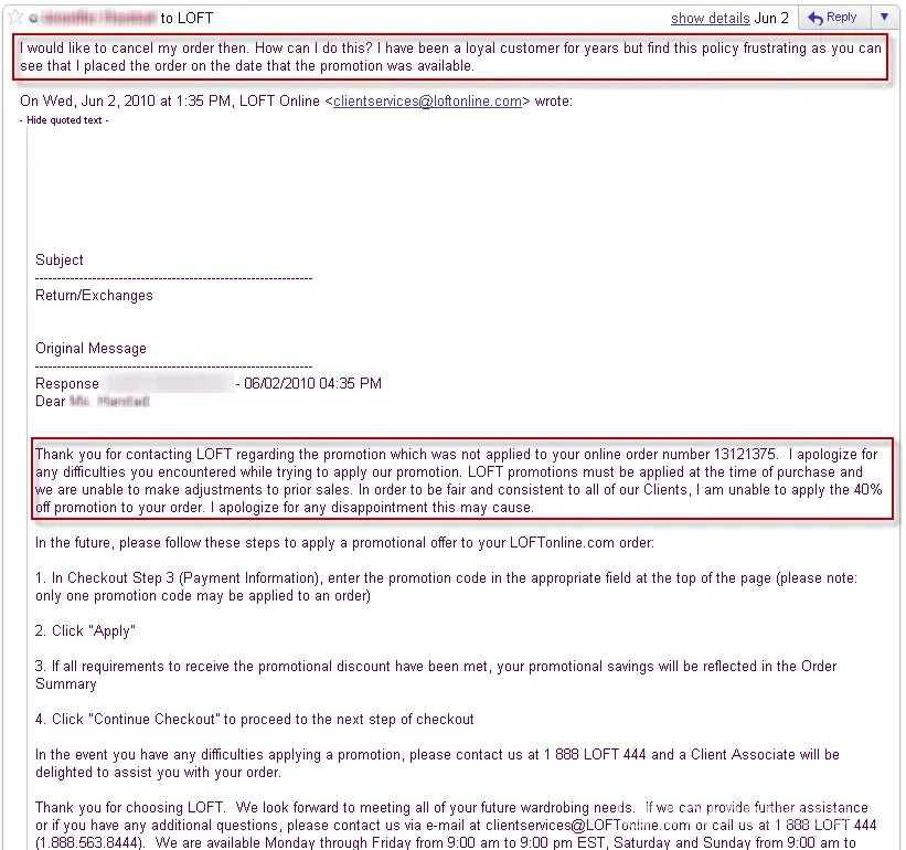 The very unfortunate news is that so many clients go in to the store and "complain" about rediculous things and get their way! Often times as a result employees get fired. Example: Sometimes clients will come in and completely bend the return pracitce getting full value for items that now cost $4 just because they stomp thier feet. Example: Clients use the 1800-DIAL-ANN line to lodge complaints. Then they go in to the store and say "DIAL-ANN said you would do this." Wheather that is true or not, the associate will likely do whatever you want out of fear, while the person behind you will be dismissed and held to practice. You made your purchase during the promotion and would have qualified for the discount the same as ayone else. If you would have gone into the store and complained you probably would have recieved and adjustment.