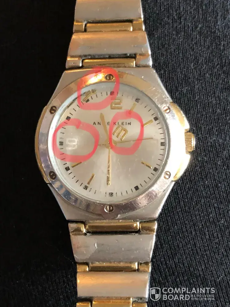 I have an Anne Klein ladies 2 tone silver and gold watch that was purchased at The Hudson Bay in Toronto Canada. I have had the watch for two years. This week I noticed that a few of the numbers had come off and were floating around inside the watch. By the end of the week all but the number 2 have come off. I am extremely disappointed in this situation. I had a watch prior to this one that I wore for 25 years without any issues! I'm hoping that you can repair or replace my faulty watch. Please see attached image.