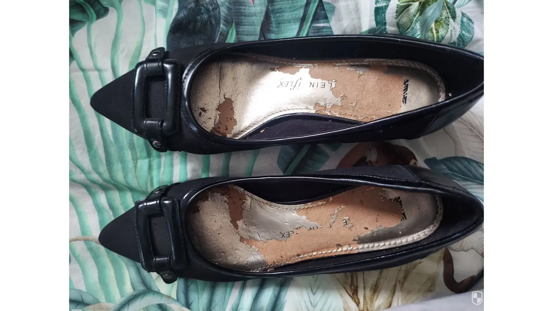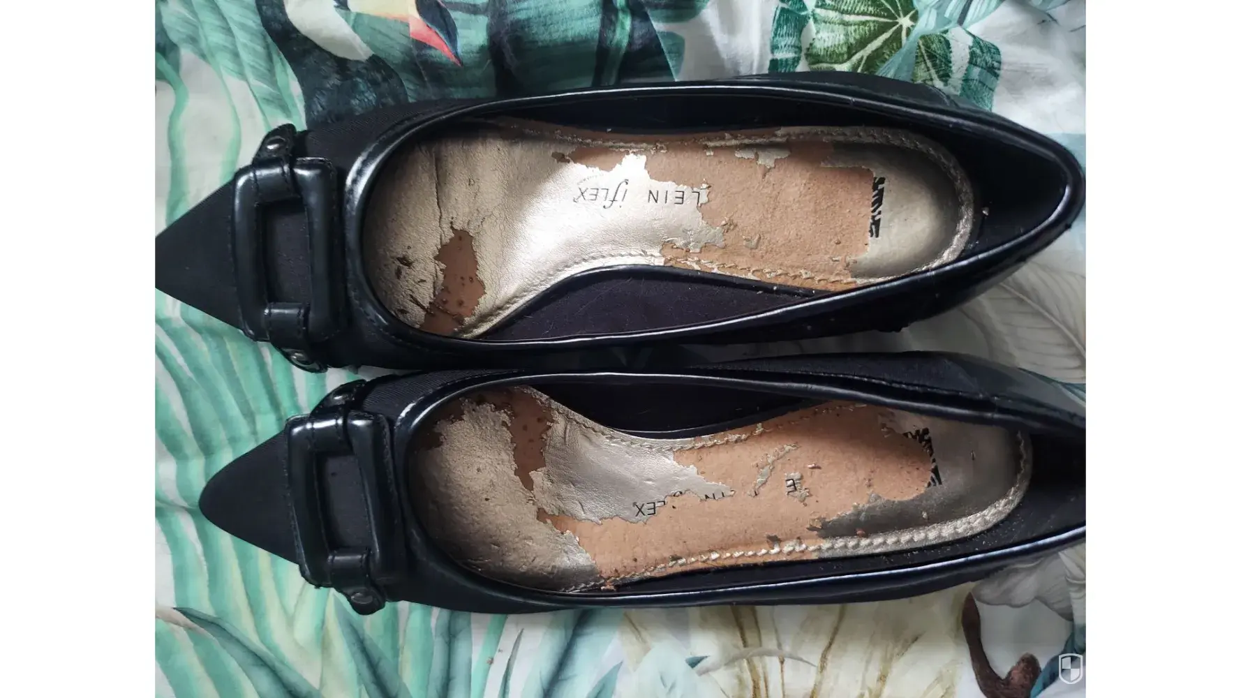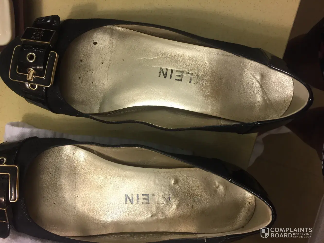 I purchased a pair of Anne Klein black dress Flex shoes at DSW earlier this year. After only wearing them 1 time -the gold paint on the inside of the shoes came off all over my feet! Little gold flecks of paint everywhere! I am very disappointed as the shoes are comfortable. Please advise. Thank you. 😀