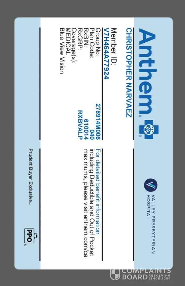 Anthem Blue Cross Blue Shield Inaccurate information provided on insurance card