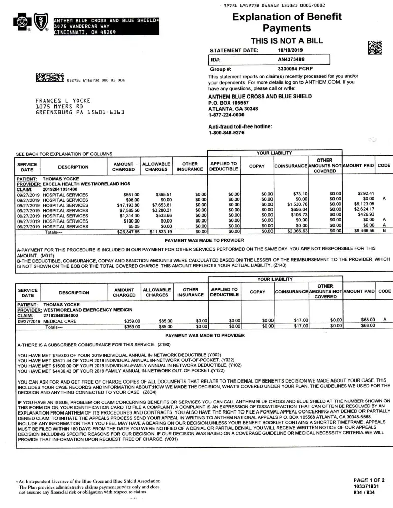 I'm now being rebilled by Westmoreland Hospital for an additional $6, 929.46 on a statement dated 6/10/2021. I contacted the Westmoreland Hospital billing department today on 6/21/2021 and I was told that the insurance company has made a retraction of the payment made on the original claim. I have contacted Athem BC/BC and tried to get an explanation and have been unable to get a customer service representative to help find the reason. Let alone they aren't able to find the original claim even though I provided them with a claim number. The claim number that I'm providing them is listed on the "Athem BC/BS Explanation of Benefits Payment" date 10/18/2019 is Claim [protected]. I've asked them for the codes being denied or retracted and they are unable to give them to me.