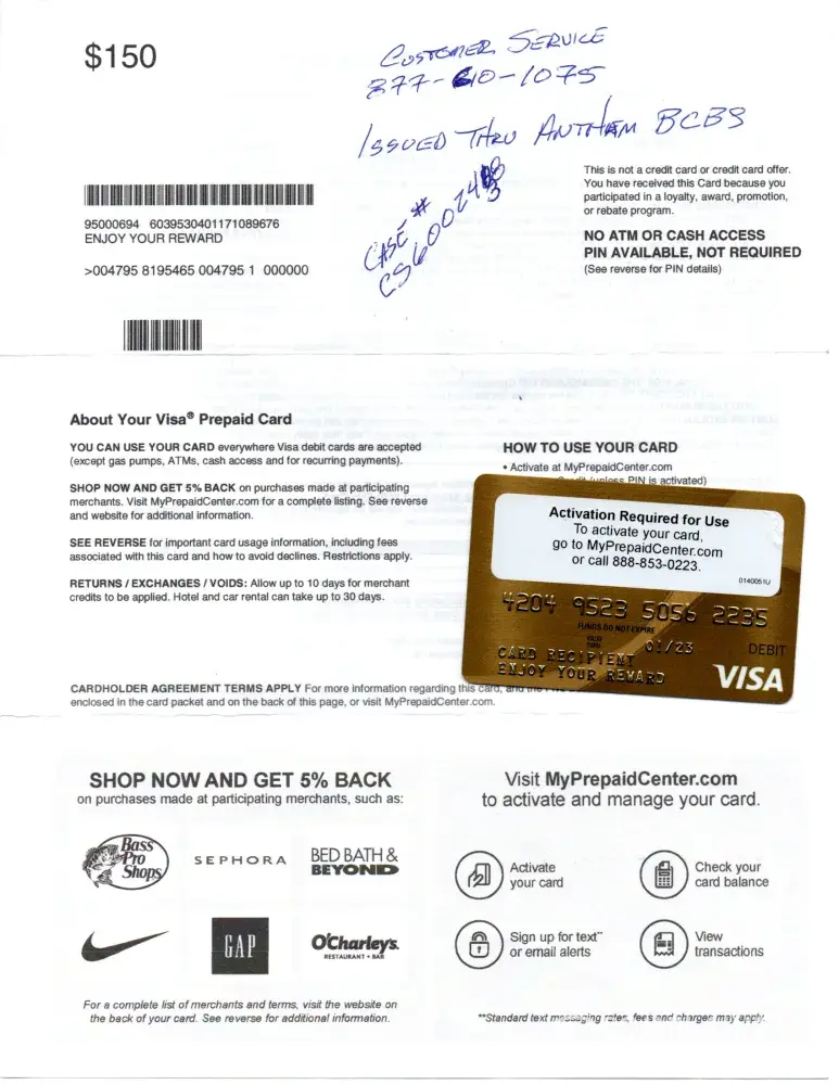I received a $150.00 Visa Debit Card approximately 12 months ago. The card is valid through 01/2023. I received the card for having a Wellness Check and other procedures done. I tried to activate the card on the website on the card and it would not activate the card, so I called the number given on the card and that would not work. So I called the customer service number on the card and the person I talked to told me that the card was never authorized, but there was no reason given for deauthorizing the card and that I would have to call Anthem. The case number was CS6002438, the call was placed in November 2021. I called Anthem support and the person told me that I needed to go to the website www.MCROpgm@anthem.com and I would be able to resolve the issue at this site. I put the website address in but there is no such website. I've called back to the support number, left a message, no return call, no help. I would like to resolve the issue, it's $150.00. My wife had $250.00 in multiple cards which we used no problem, I had another $100.00 card which I used no problem.