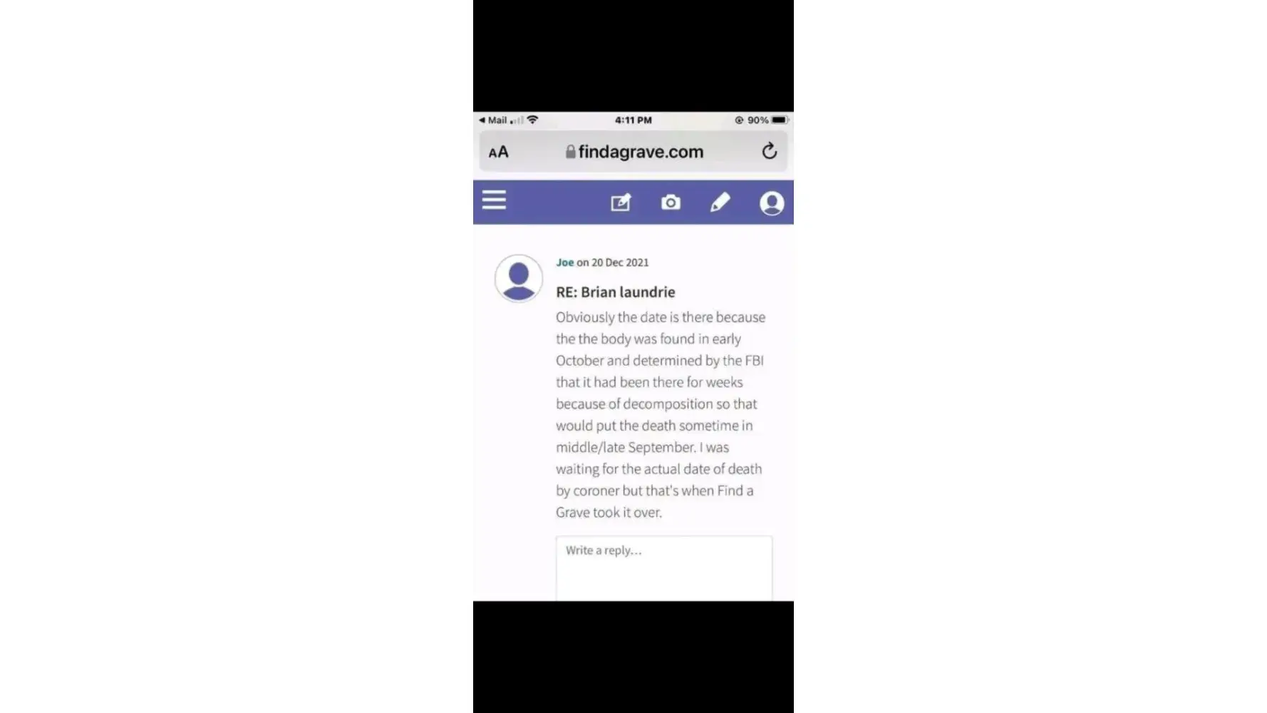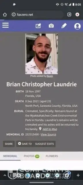 Brian Christopher Laundrie, age 25, used to live at 4343 wabasso ave, north port Florida, who murdered Gabby Petito on 8/27/2021, was abusing her capitol 1 bank card and found deceased at myakkhatchee creek environmental park on 10/20/2021, obviously, Roberta M Laundrie, who called police on bounty the hunter, Dog Dwayne Chapman, to not go search for her son on 9/25/2021 after caviar Dogs couldn't smell the human remains, 3ins and 2outs at Carlton Reserve when the Laundrie made their two short camping reservations [lawyer Steven Bertolino said that he came home on 12th and left on the 13th of September 2021] and Brian Laundrie couldn't be at myakkhatchee creek because he was accessing on Pinterest (saving @lolroses's post, https://www.pinterest.com/pin/645914771565096021/, see at attachment 5&6) on 10/15/2021 under his handle: blaundrie1197, when they found him dead since 9/8/2021 it says on his find-a-grave post, see at attachment 3&7, http://findagrave.com/memorial/232315490/Âbrian-christopher-lauÂndrie? fbclid=IwAR0PdÂTUEAw60Ie7BslV1u2IPEÂgCqUENZqNCD-0 — 0j_XuÂoLYi80Jit3EbZA. Whether Brian Laundrie, see at attachment 1&2, is dead then why on Facebook, https://m.facebook.com/profile.php?id=100070509852972&eav=AfZ7yHH7kyN3wvMPVXfHRbgDW4fo4DcSIF71HYG2gzctdbgcF35PJPDf4Fh2ctE3mP4&refid=46&__xts__%5B0%5D=12.AboYZKiy_D6Ez5IdSTnq0mOO-Qzj5a7Ms_E8yNgiQ10psY-jdBkQKlBsPiFehfa2P6mnkjCicct8o4d3OXp551xoDhtY7Ll4K8SBK4qzUu0Jd6uS68LJUkyHnty9Zz_wmBVJSNaQDMA852BCyb8XzWzNDYsc46L5n7xsEiI8h2PyMHFe80JT0_WgX0sOo4F8kjE05AT392MpIFdd_uGCWrlm-iyqtTPv7Y9RoPy3X_S3rEjnPt5ICbF7CwErYRRG8YxTA6IWsIeYQ5xNgdxZdKqfzIEnjMN6Zojz-uEoyWbMMlik4ypuIlxNI8MSTqWpAA1ltPYEaIWSvPUo_t-YzDUKujr_li29ia178uikHAF_JqxTqeKojhit8K4hORzOwUO5jRISgzVkn310lLfwexdeTNBj3IYzfElh_l8y5AkWONG9wfbAZ4CNzl07_ZmIz61C_rFW4qaVBSUX0GYHblBqC13oFxAbBx2LMEQ9AJA8QOuaPE5gfUFkpMi4OObYl4uyt4uyPBTjsLtFnRAyC4lnGXKJ-5BYSzq_cVfdNYQiQGA1l0Dm0fOCHaGBgA_0eTcqao7qhsxcpFGP9N9Qsxor4hJ9BtRNR5rR5eOC7CA8xMlrttW-Gdp9ljBqzvW-208&__tn__=C&paipv=0, claiming that himself not dead, https://www.nbcnews.com/news/us-news/autopsy-brian-laundrie-s-remains-came-back-inconclusive-attorney-says-n1282259 and said it was cover up incognito. Joe, https://www.findagrave.com/user/profile/47507237, see at attachment 4, the creator of his find a grave, knew about his death and started his funeral on September 26, 2021 when his human remains was found on 10/20/21 by the fbi.