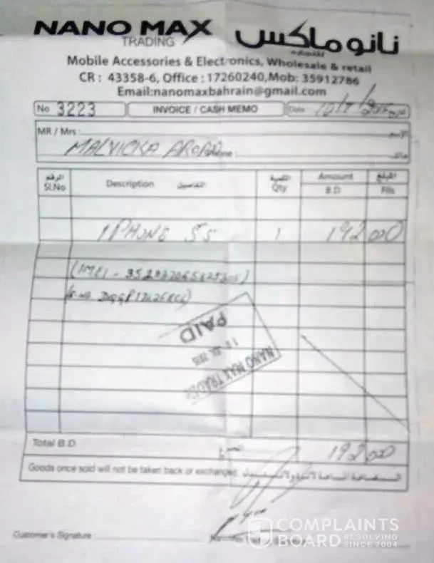 I bought this Apple Iphone 5S (16GB) from M/s Nanomax Trading, Bahrain on 10/07/15 vide bill no. 3223 which i took here to India. The phone works only for 3 months and after that "No service" message appears and from that time it is not functioning. I tried other sims too but every time same messages appears. I mailed it to Apple Customer Care but in vain. Then I some how manage to send it back to that shopkeeper in Bahrain, according to him he has repaired it. But once again I inserted the sim and within 2 hours the same message appears and it stopped working.