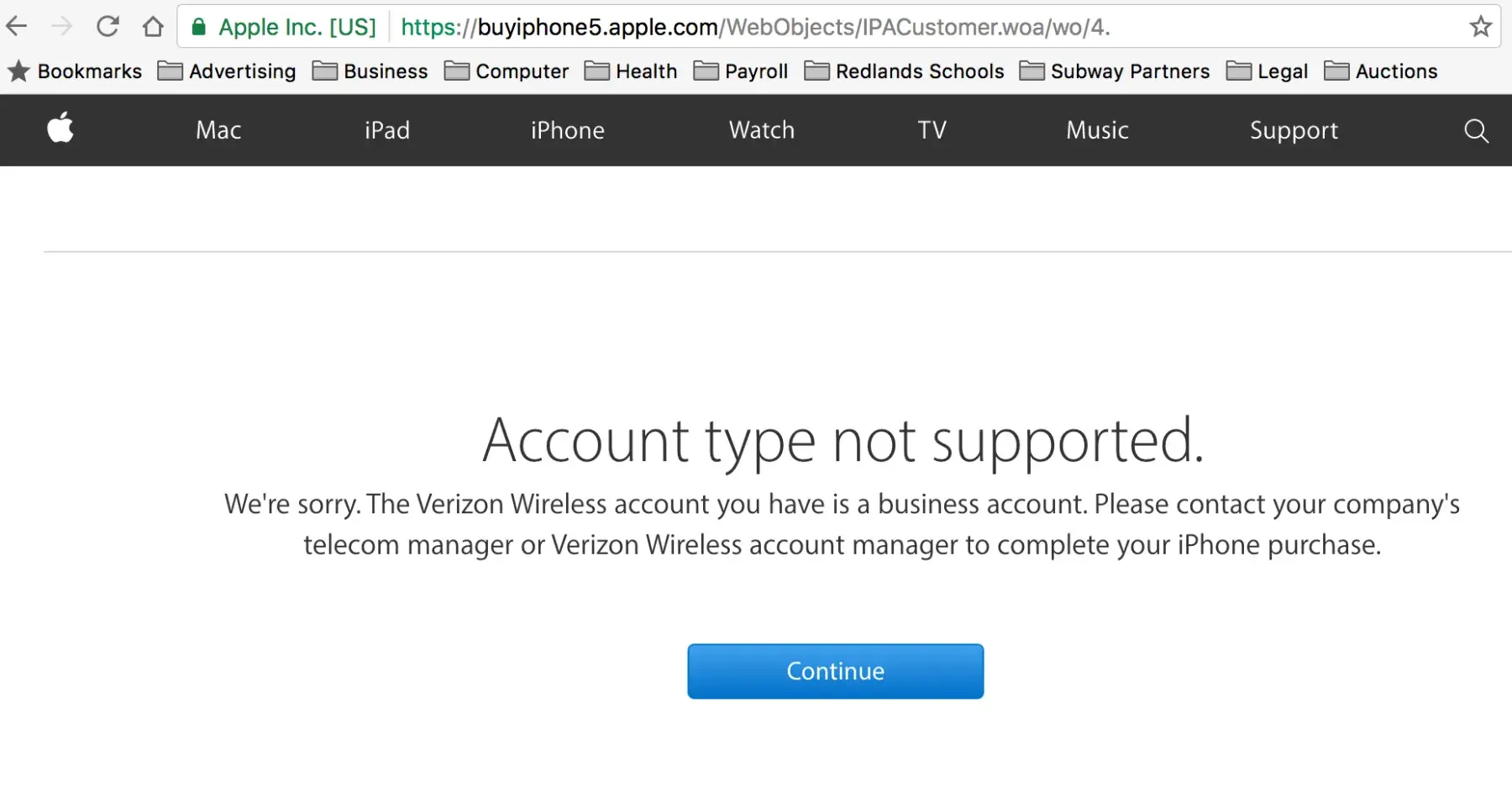 Trying to purchase 2 iPhone 7 phones online via Apple's website. I am purchasing both phones at full retail cost. Apple is asking who my provider is for cellular. I choose Verizon. Then the website claims that since my account with Verizon is a business account I first need to contact Verizon. I'm paying full retail Apple for both of your iPhone 7's. Take my F'ing money and send me my F'ing phone next week. Because Apple can't get their crap in order I can not place my pre-order for my two iPhone 7's! What the F is wrong with this company?