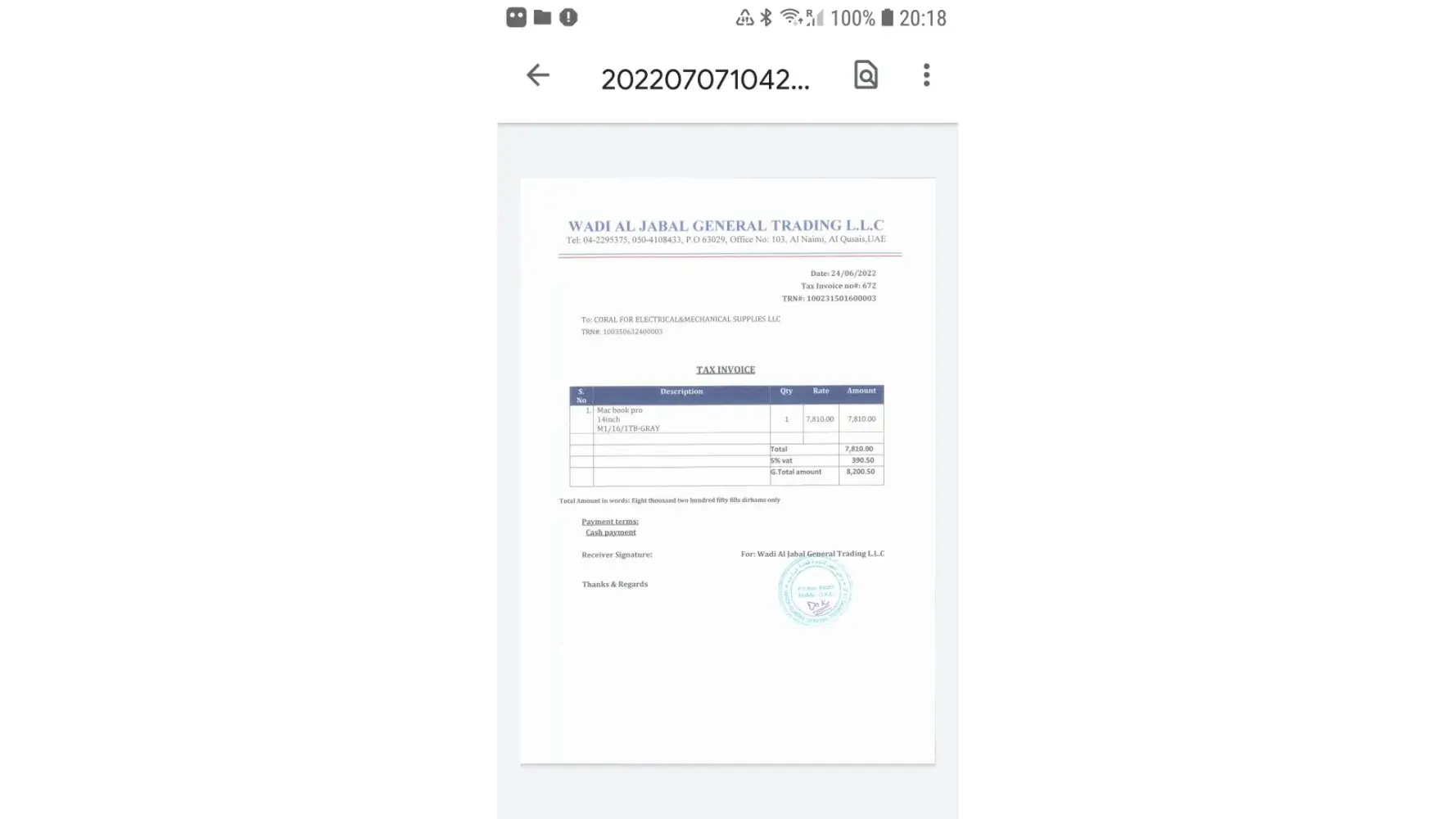 Apple macbook purchased from Abudhabi on 24/6/2022 with 1year International warranty.(attached ref purchase invoice and laptop details) for ref.