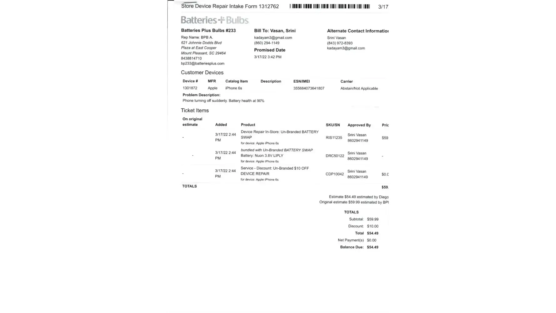 Batteries Plus Charge with taxes: $54.49 (