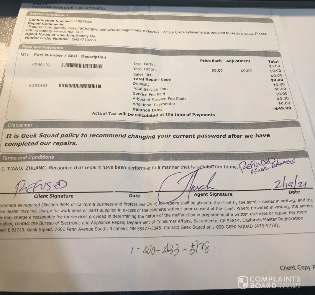 I scheduled iPhone battery replacement service at 4:40PM on 2/16 on Bolingbrook IL. The guy works in the store checked my iPhone and did not say any other issues regarding my iPhone except battery damage. I came back to the store around 6:30PM on 2/16 to pick up my phone and was told my iPhone charge damaged, they changed back my original phone battery and refunded the service fee ($49.00 plus tax), nothing can to with my charge. I refused to accept it and finally the store manager said they will contact APPLE. I did not get any feedback on 2/17. I went to the store around 11:30 AM on 2/18 and was told they will contact me later. I missed two phone calls from best buy around lunch time, no one took the phone when I called back. I went to best buy store around 11:30 PM on 2/19. The store manager told me they refunded $49.00 and my phone. He was told me to upgrade my phone. They cannot do anything. I refused to sign since the phone cannot use anymore and they damaged my phone after I left my phone in the store. I tried to communicate with high level. The store manager was very rude and told me he is the upper lever, he left my phone and paper on the table, then left. It is so bad experience in Best buy.