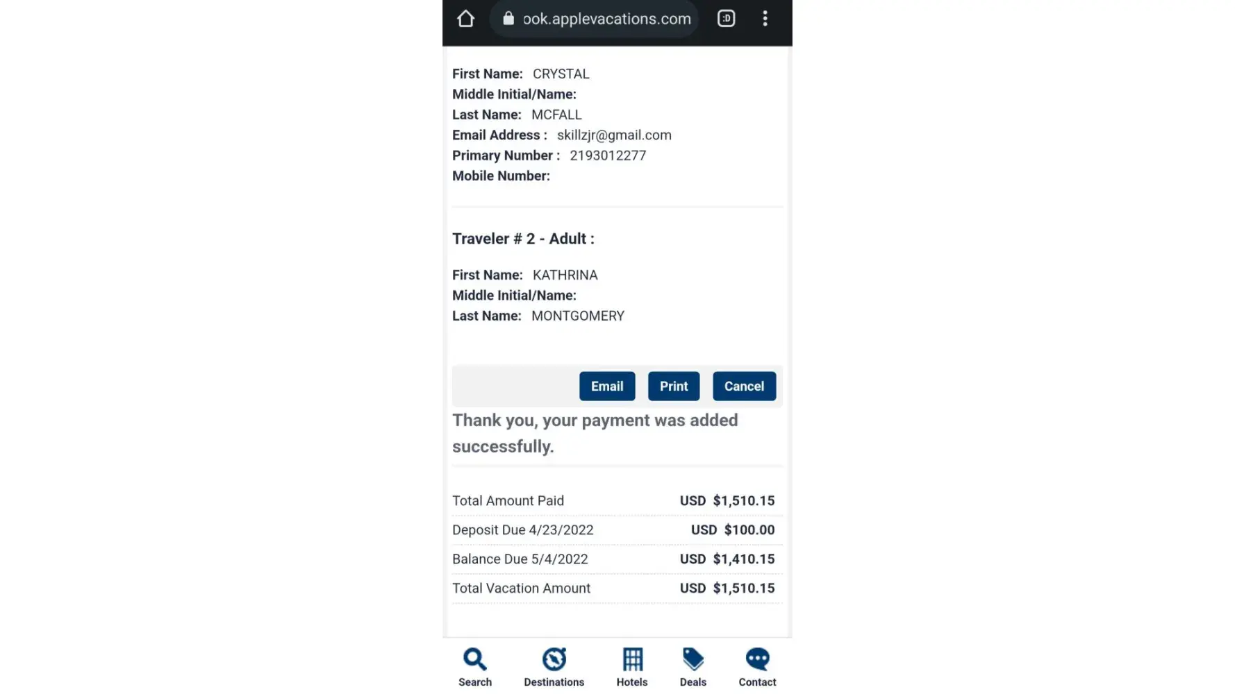 I called and was transferred to several people and finally told to go to Customer care @apple vacations. com and they would review emails and get back to me.