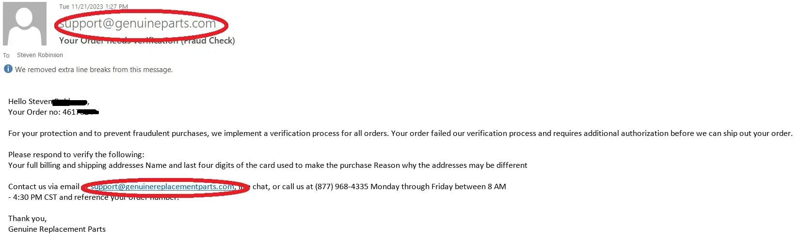 I ordered an oven rack online. The next day I get an email asking me for personal information to "verify" my address and card #. The email asked me to send that information to a different email domain. Which I of course refused to do for obvious reasons. So I called them on the phone and asked what it was about and they asked me for my personal information...