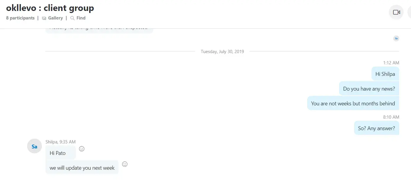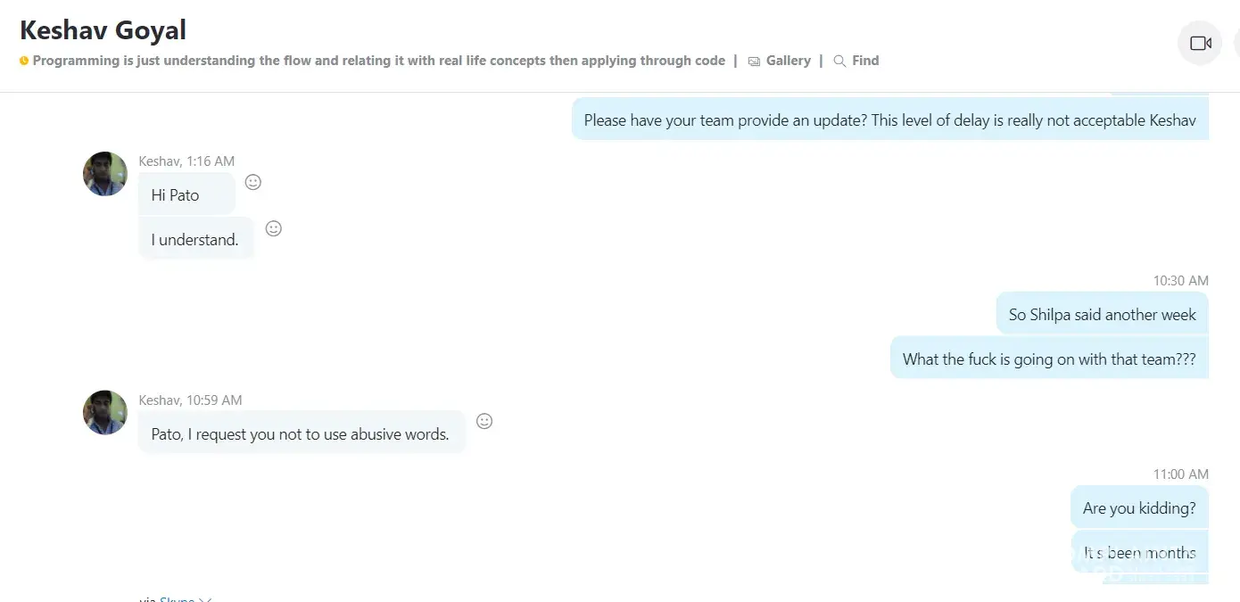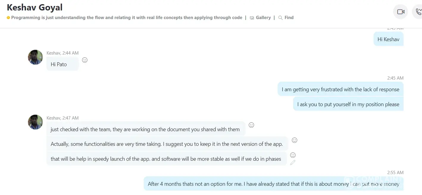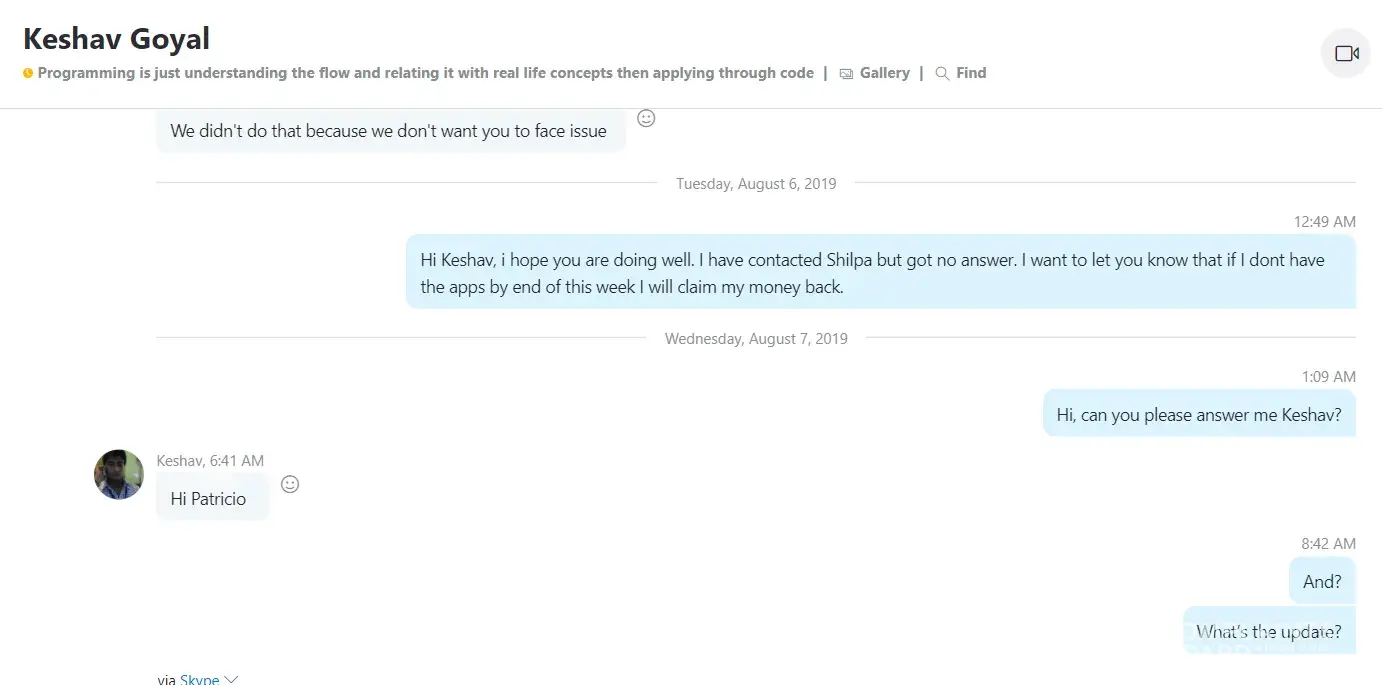 On or around 21st September 2022 we engaged this Indian company to develop an All-In-One software for our Taxi Business, Delivery(Courier), Food Delivery, and Tradesmen business. The company quoted us $4000 with a delivery period of 7 days. The company demanded payment before commencing the project and we effected a $3500 payment by 24th November 2022. To our disappointment, they started backpedaling on several deliverables, deliverables such as completing the project within 7 days as advertised on Facebook and other social platforms such as Instagram. From the time we paid the $3,500, the company has failed to deliver a working Mobile App as can be evidenced by the many follow-up emails below. In our quest to get the company to deliver a working software(Mobile App) as agreed, we have made several follow-ups via the project Skype group that was created as a way of easing communication but to our disappointment, the company has elected or chosen to ignore our messages or respond to our several emails.