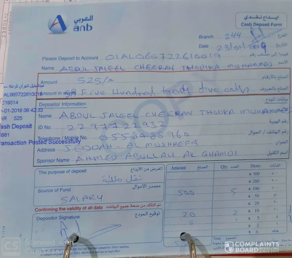 I would like to share my very bad experience with ANB . I am really disappointed regarding this ANB service's. Before two days ago around 5 pm i went to ANB ATM machine which one near to my home in suwadi Riyadh. I deposited 4200sr by ATM and immediately i recived deposit Massage which was i expecting and after 5 second i got one another massage which was reversal massage mean transitions REVERSED without money back .Then i starts process to get my losted money get back i call to the Number mention on ATM machine for help but he give me one another number for putting my complain .then next day i visite the same branch for asking my money & the person from csr he say wait 24hour and then call to helpline they will do or return your money .Now 52 hour after i am trying to contact help centre bt there is no one to attend my calls i really disappointed..so iam requesting to ANb managment please help me regarding my money or give me any batter idea to get back my money...