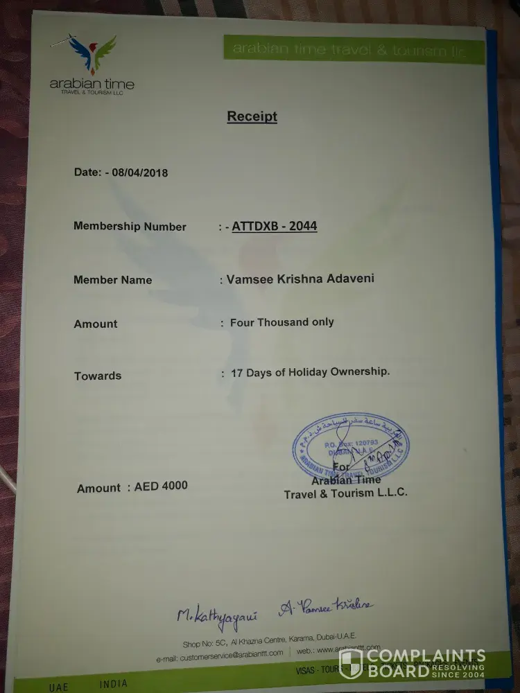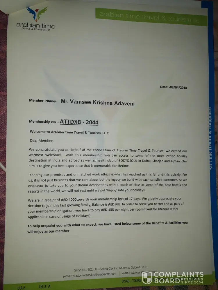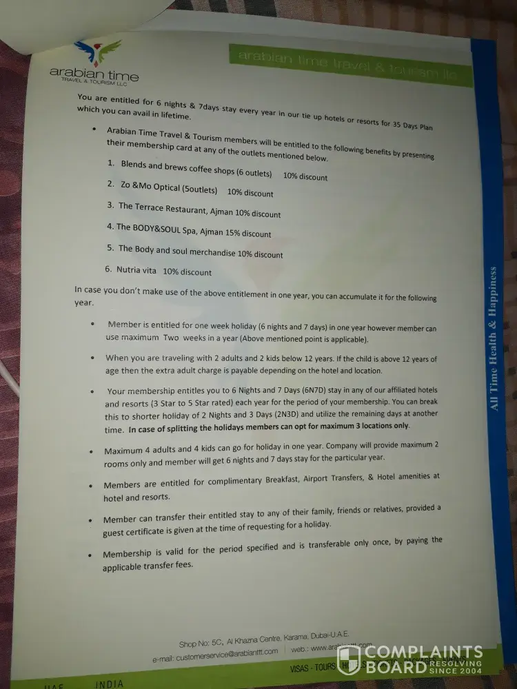I paid AED 18000, for Arabian Time Membership which include travel package, Hotel Accomodation and Health Club Facility, I am trying to contact them but unfortunately, all of contact details is not working . I think they are fraud company, i am going to complain police,