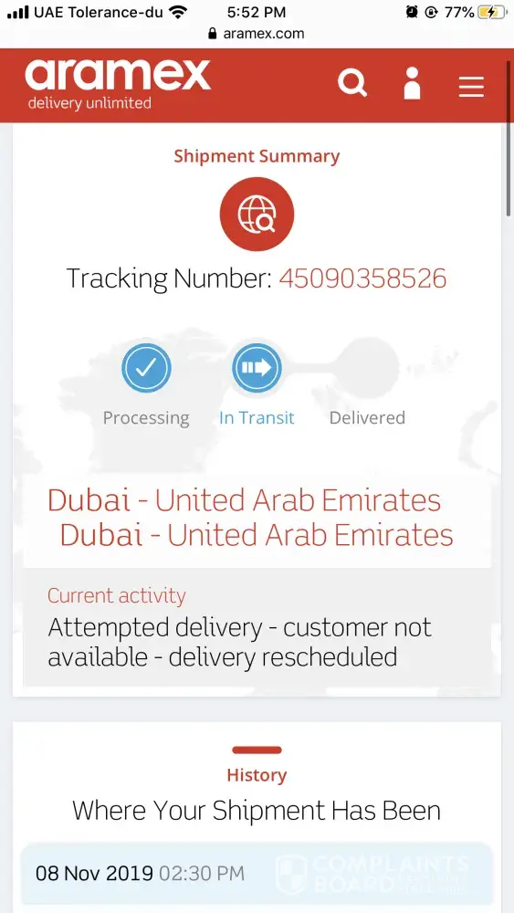 7th November, Thursday, 10:24am - i received a call from aramex re my parcel. I informed the person on the other like to deliver between 4-5pm as i will be in the office (delivery location in JBR) at that time.