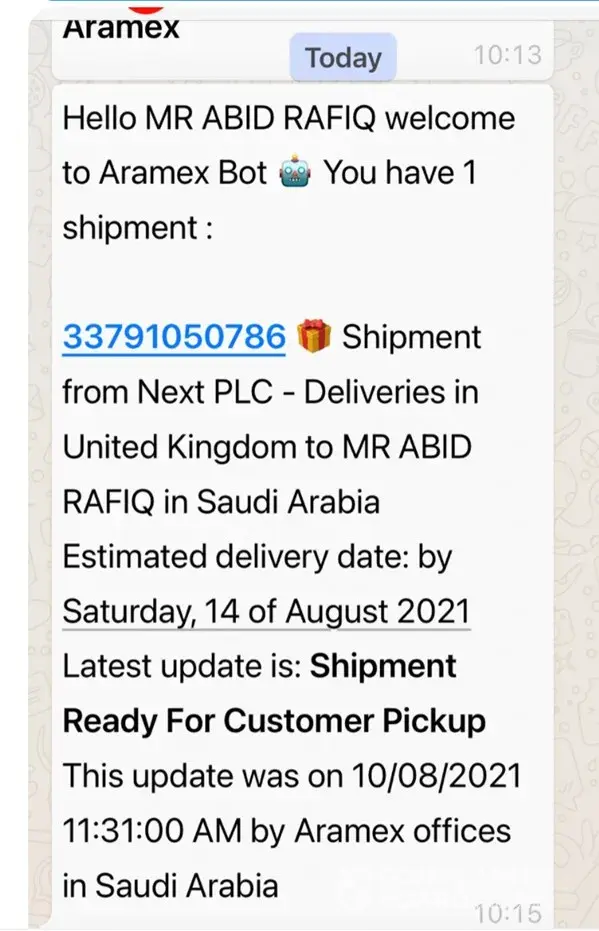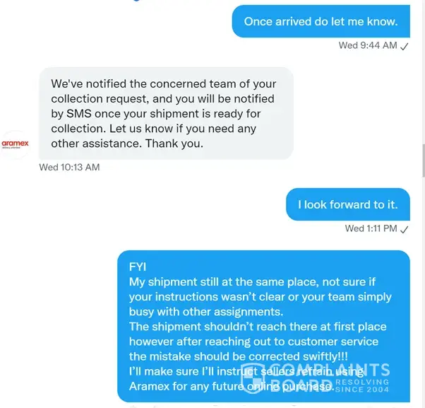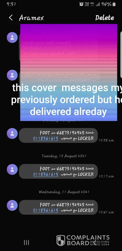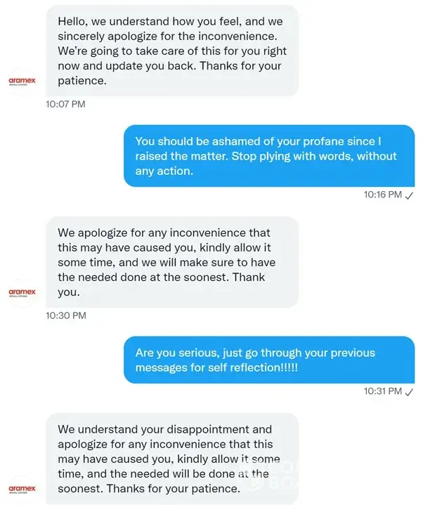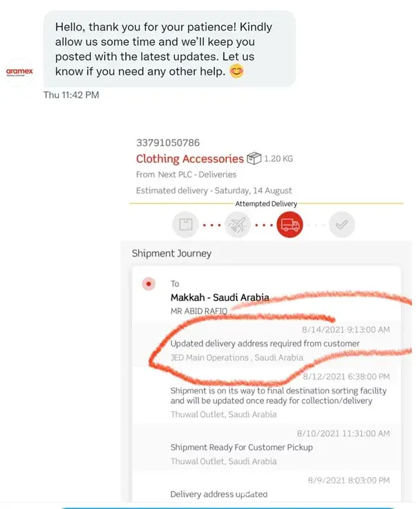 I have a complaint about the aramex services here in saudi arabia delay deliver already 3days to contact me but he call and then he turn off after I answered, three time he make and I call back he make it busy my call. And i call also the customer service but he answered okay i follow up but nothing happen. I'm so very disappointed happen to me. I hope you do action happen like this your franchise. I attach the message from aramex.