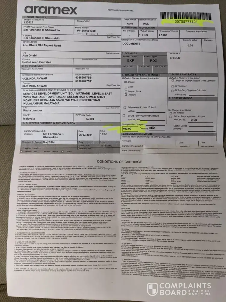 The envelope with important documents picked up from Dubai Business Bay on 16th Aug 2021 hasn't reached India as yet . It's been 10 days . I have mentioned it's Important documents . This is so unprofessional. And there is no revert on the online complaints registered multiple times on the aramex site!