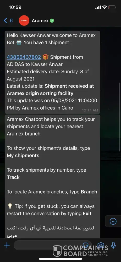 I ordered a product from adidas online and I supposed to receive it with three days as they mentioned in the delivery terms. I receive a msg from aramex stating that I'll receive it on 8/8/21 then they didn't send it when I called to ask they said that there is a problem with my address although it's not the first time to receive from them packages on the same address so that was invalid reason for me, I called to complain the stuff was so polite and considerate but still haven't received my shipment.