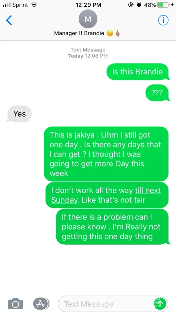 I work at the arbys on Preston and outter loop in Louisville Kentucky. My name is Jakiya I just started working there . I had told my manager that I couldn’t take out the trash because it was to heavy her name is ms.rene. She then later took all my hours and made me able to work one day . This is the second week of having a one day . When I try talking to her she makes it like everything is okay . I feel like she is showing favorite toward some employee . I can not live off five hours every week . Something needs to be done, I don’t want to stop working but seems like I need to five hours is not living