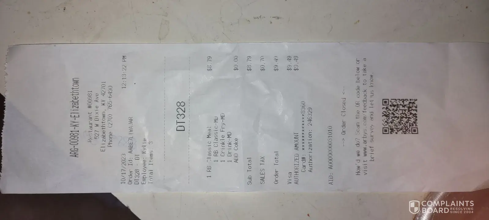 I went to Arby's at 527 w. dixie ave. elizabethtown , ky 42701, store #00981. oct. 17th 2023, at 12;13'22 pm, the whole order was cold, the bun was stale, i pd. 9.49 for cold food, i will not be going to that Arby's again DT328-DT, EMPLOYEE Kylie, order id. AABE7LTWAJAR