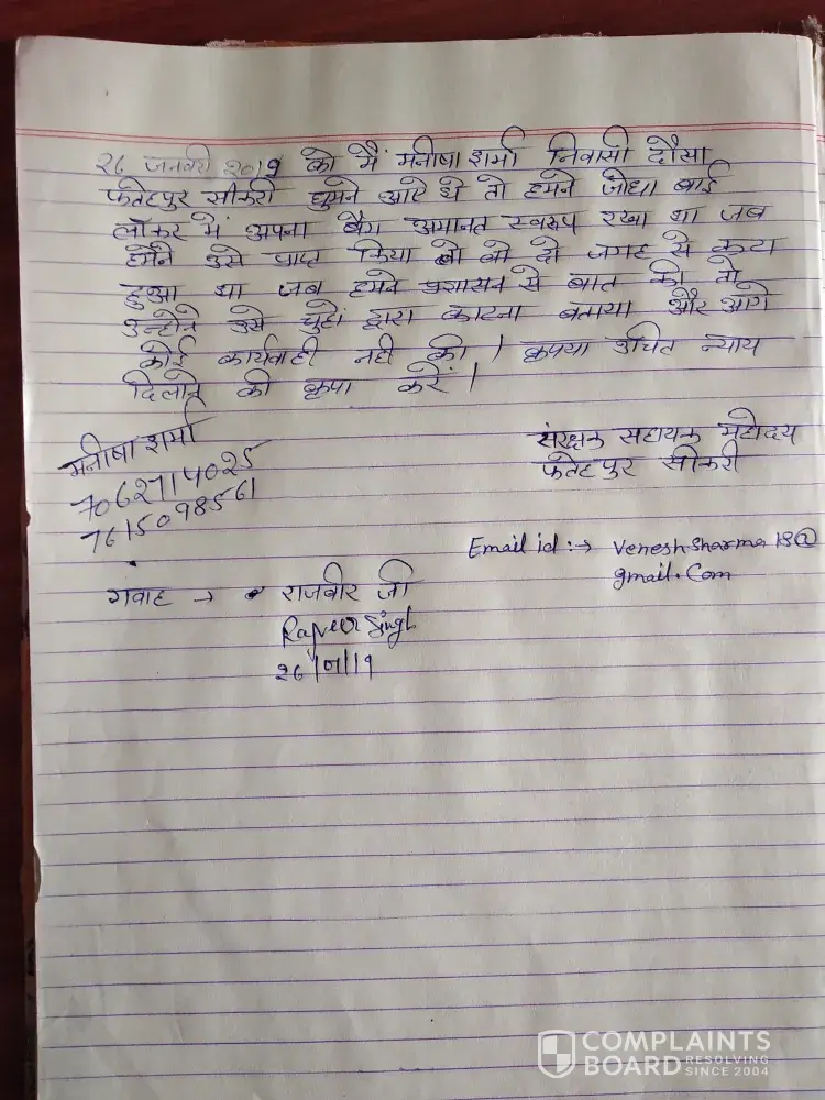 Hum 26 January 2019 ko Manisha Sharma 'residential from dausa' fatehpur sikri ghumne gaye the. Vha pr jodha Bai loker me humne hamara bag ko amanat swaroop rakha tha Jab humne bag prapt Kiya to vo do jagah se kata pata paya jab hum ne management se baat ki unho ne y kam chuho (mouses) ka karya bataye aur Hame unsatisfied jawab Mila. please Hame justice Dene ki kripa kare aur immediately action lo ayr hamara nuksan bharpai karne ki kripa kare.