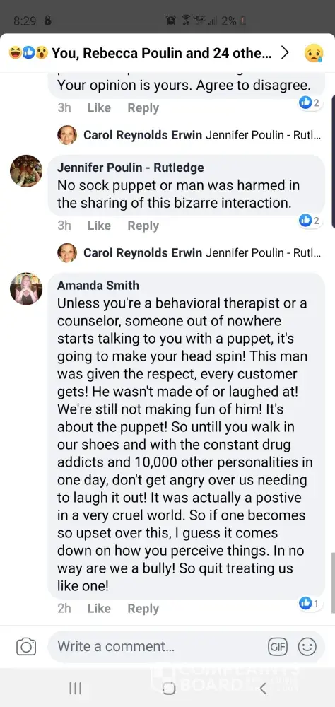 One of my family members saw her post of one of our mentally I'll family members that's he posted on facebook. She took a video of him off the security footage and subjected him to be made fun of. This is completely disgusting. Her coworker Amanda was mocking other white tried to defend him. DISGUSTING and possibly against the law to record security footage and post on a public forum.