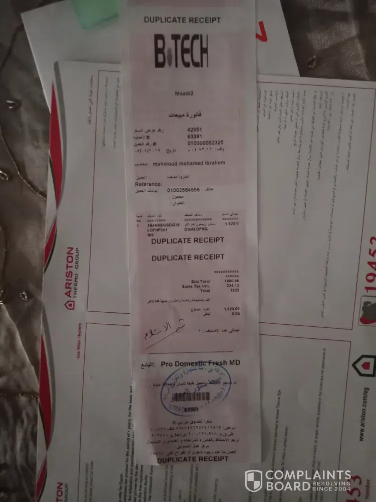 I want to complain about safety issue regarding a Gas Water heater 6 Litre which i have bought on 05/04/2019 I bought an Ariston Gas water heater (natural gas)from Egypt with Model number : DGI 6L DF NG at B.tech Maadi Branch -Nasr street with Transaction number 63381 with the cost of 1825 EGP.