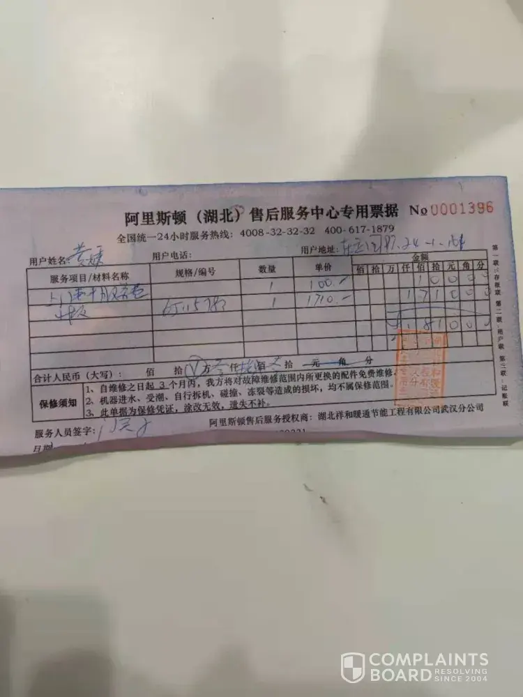 We called the after Sale service of Ariston immediately, they came up and told us the PCB board was damaged, charged us 1810 rmb without negotiation.