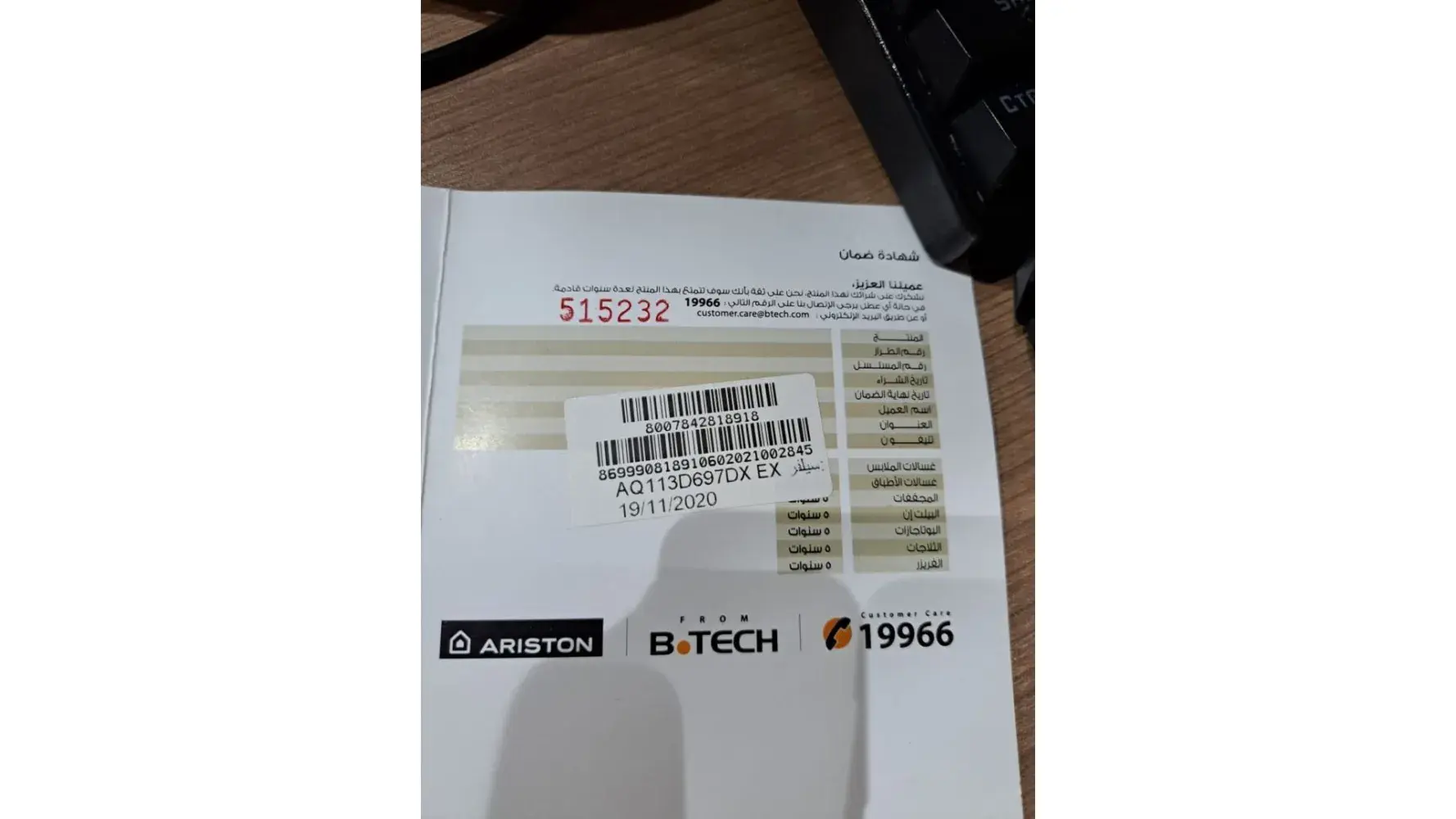 Received email from Ariston January 31 2022 telling me our registration of warranty card had not been received and the product was not covered herewith for any longer than the 1 year standard warranty. It was also stated that by returning the warranty card supplied with the product (Ariston does not accept responsibility for any card that is sent and not received)