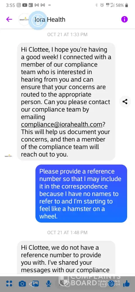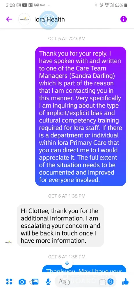 I later spoke with Ms. Darling's Director (Diane/no last name given), however it was clearly perfunctory. I was inquiring about how I might escalate my experiences and concerns; however a process of accountability was. I therefore reached out to Iora on Facebook Messenger and was advised to contact your office by the anonymous responder that answers inquiries on that platform. [Those messages have been downloaded. ]
