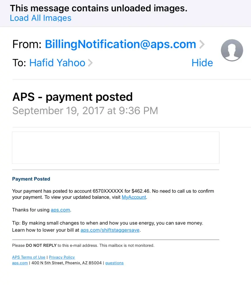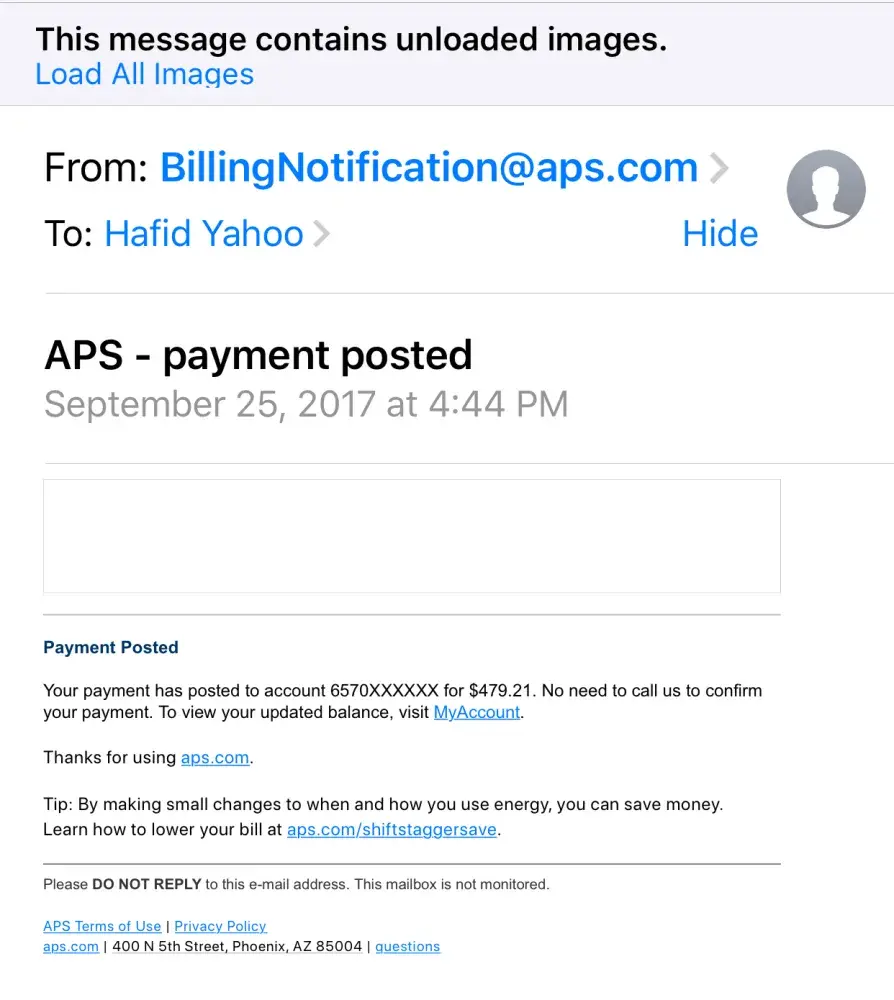 Because APS got a returned mail notice from us, we never got a statement, and there was no courtesy call to let us know that was the situation. My fiance and I have lived in our apartment for 6 months and for some reason the customer service team just can't get that right. Didn't get a statement in the mail having busy lives we lost track of what we owe and then all of a sudden shut off to the correct address? My fiance has spoken with 3 different people trying to pay our bill, after being disconnected twice and no one had the decency to call him right back. APS has by far the worst customer service out of any company that I've ever had to negotiate with.