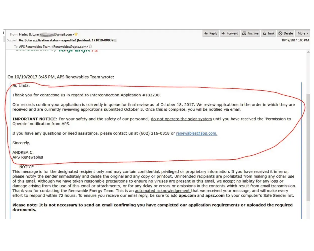 APS should be REQUIRED to expedite ALL inspections and PTO requests from solar installers ASAP, in order to promote the use of sustainable energy, rather than the dirty energy APS produces in large measure. APS is deliberately stifling competition from solar companies in an effort to protect their own monopoly. They talk a good game, but the reality does not match their hype.