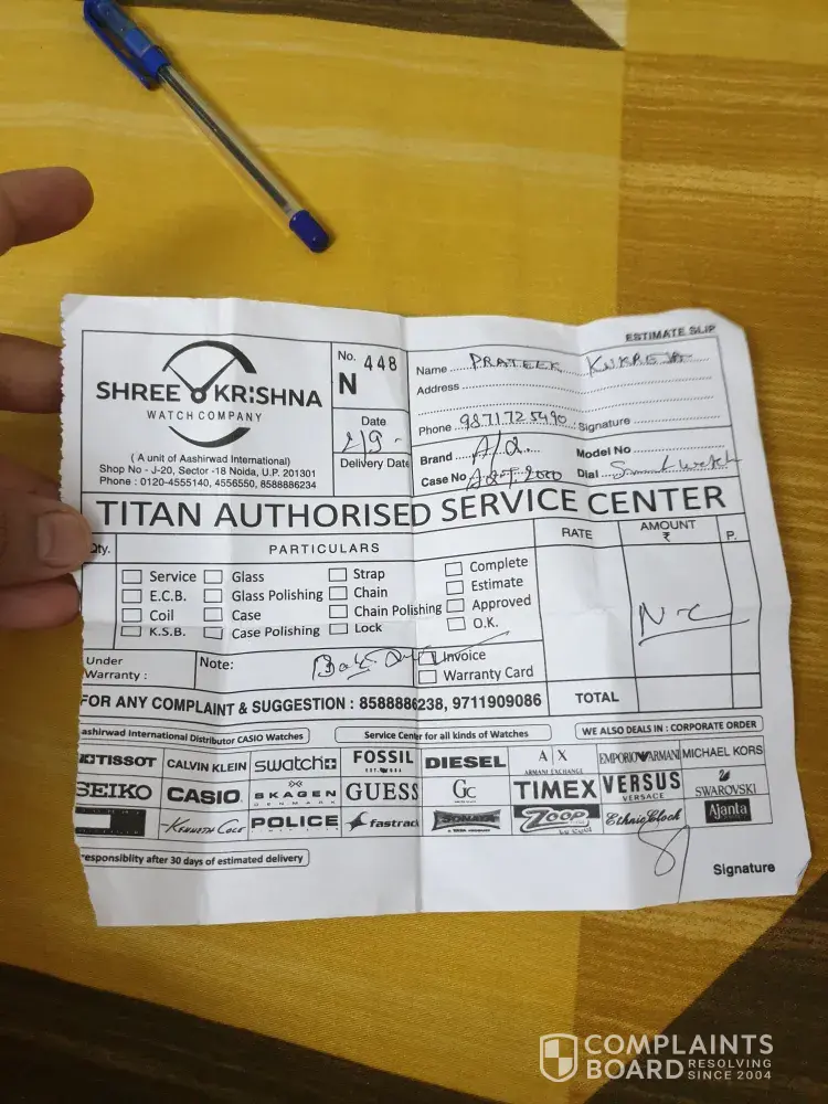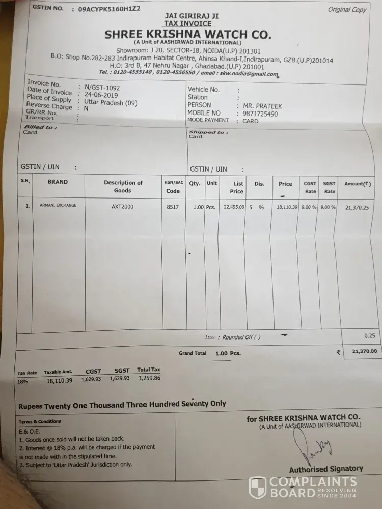 I had purchased Armani Exchange Connected smart watch on 24 June 2019 from Shri Krishna Watch Company, Sec-18, Noida (Dealer Code: AXT2000) for Rs. 21, 370/-. Within 2 month of use, the back panel of the watch came out, apparently due to over-heating. I raised a service request with the dealer on Sep 2, 2019 and I was told that it will take around 1 month as the watch will be transferred to the Bengaluru service centre. After waiting for more than 1 month, I was told that the watch could not be repaired and the company has sent a credit note of Rs 13000.