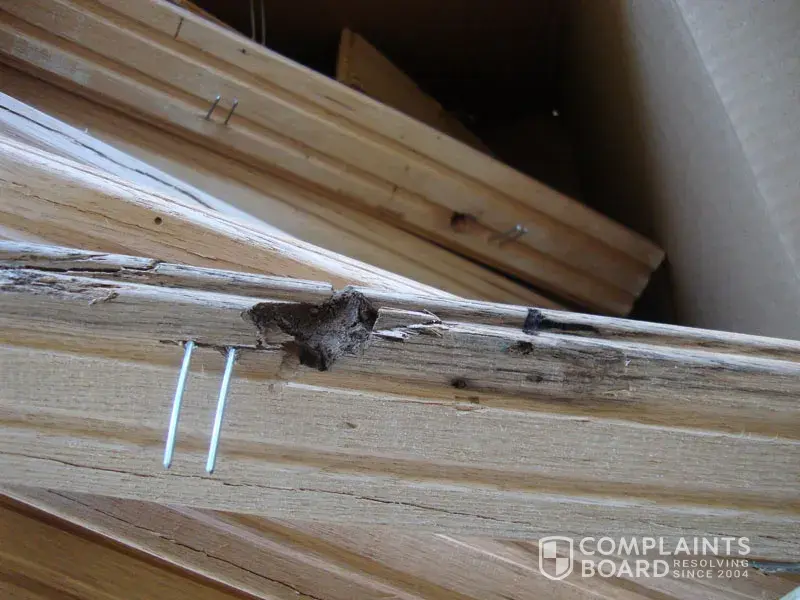 I am having the same exact problem with both homedepot and armstrong. I bought the wood on July 3, 2012. I bought 48 boxes and about 80% is damaged. It has the same holes in the wood as the ones in the pictures above. I now need to get an exterminator and do not have the money for it, I will have to make sure the plywood is not infested with the podwer post beetles and GOD knows if I will have a problem in the future because I just purchased new kitchen cabinets. It will cost me about $1, 000.00 more to rip out the wood and replace it. It is just too much of a headache and hope that homedepot and armstrong takes care of the problem ASAP.