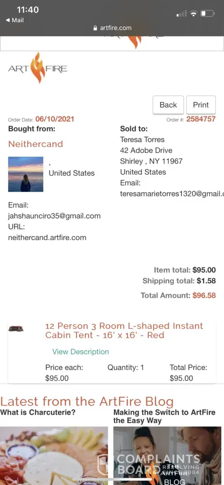 I ordered a tent a while ago and never received it. I've been trying to contact the seller but it's saying they're no longer available and I haven't heard back from [protected]@artfire.com. I need a contact information so I can get my refund back. I've emailed and there's no way of me being able to call.