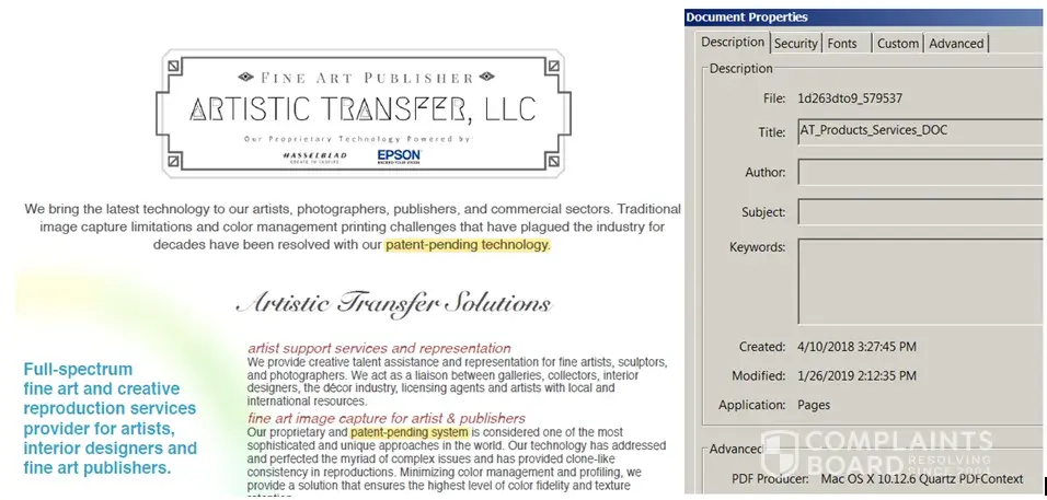 After I was contacted by a representative of Artistic Transfer I downloaded its product services document from its website and learned that it is falsely claiming that it has a "patent-pending system". This document was created on April 10th 2018 and revised on January 26th 2019. As of December 3rd 2020 this false statement has not been removed from its website.