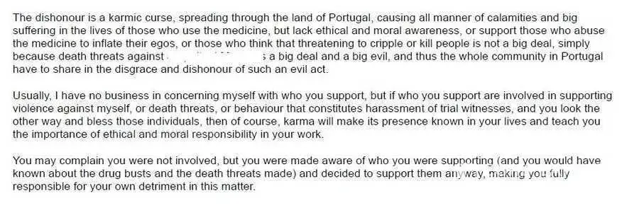 Police Witness threatened with Murder and Violence by friends of Tabula Rasa Ibogaine Therapy Retreat Centre in Portugal was told to grow up after being shown evidence of criminal wrongdoing by their therapists. Alvaro de Ferranti joined in the abuse, insulting and mocking the witness as nonsense and implying he was a child. He then claimed karma was a...